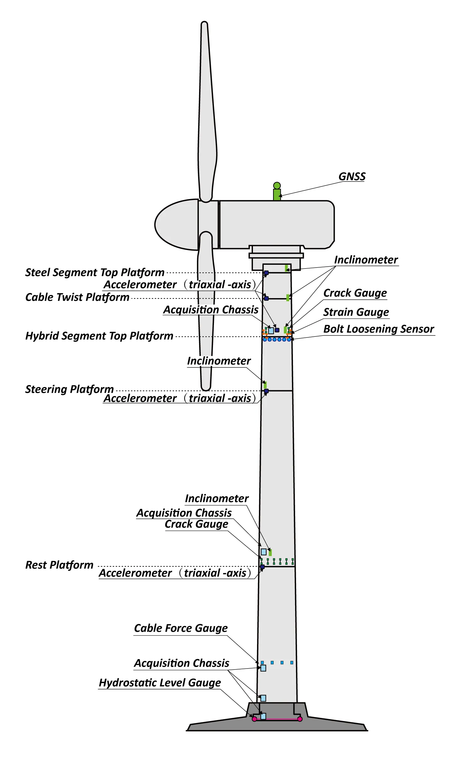 상태 모니터링을 위해 풍력 터빈 타워에 관련 센서를 설치함으로써 풍력 터빈 타워 구조 구성요소의 주요 모니터링 내용에는 타워 진동 모니터링, 타워 경사 모니터링, 상단 전환 부분의 응력 모니터링, 타워 본체 균열 모니터링, 타워 변위 모니터링, 타워 기초 침하 모니터링, 케이블 힘 모니터링 등이 포함되어 풍력 터빈 타워의 안전한 작동 목표를 달성해야 합니다.